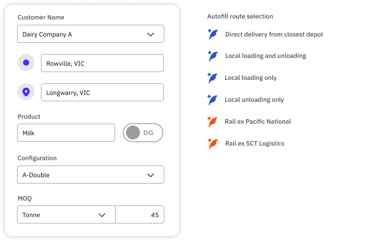 Enter rate details such as sender, receiver, and tanker configuration. Choose from customizable, pre-filled route templates or create one from scratch.